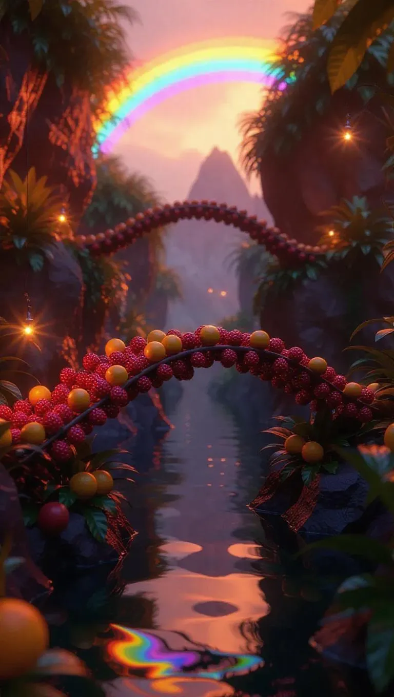 A whimsical bridge intricately woven from shimmering raspberry skins, connecting two floating fruit islands adorned with zesty citrus fruits. The islands hover above a misty, enchanted desert oasis, with a rainbow arching overhead and glowing fireflies dancing around the bridge.