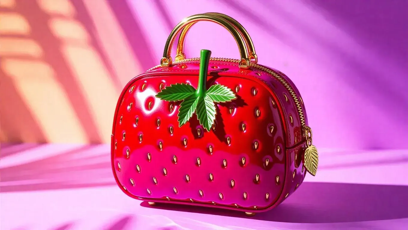 Text to ImageA star-shaped strawberry handbag with golden zippers and a tiny leaf charm, exuding a playful charm, set against a lavender backdrop, with bold abstract patterns and vibrant, sunny lighting.Recreate