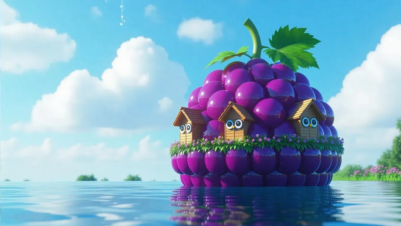 A vibrant floating habitat shaped like a giant grape, decorated with miniature owl-shaped houses and rivers flowing with sparkling juice, drifting under a bright afternoon sky, with fluffy clouds and a warm hug of air.