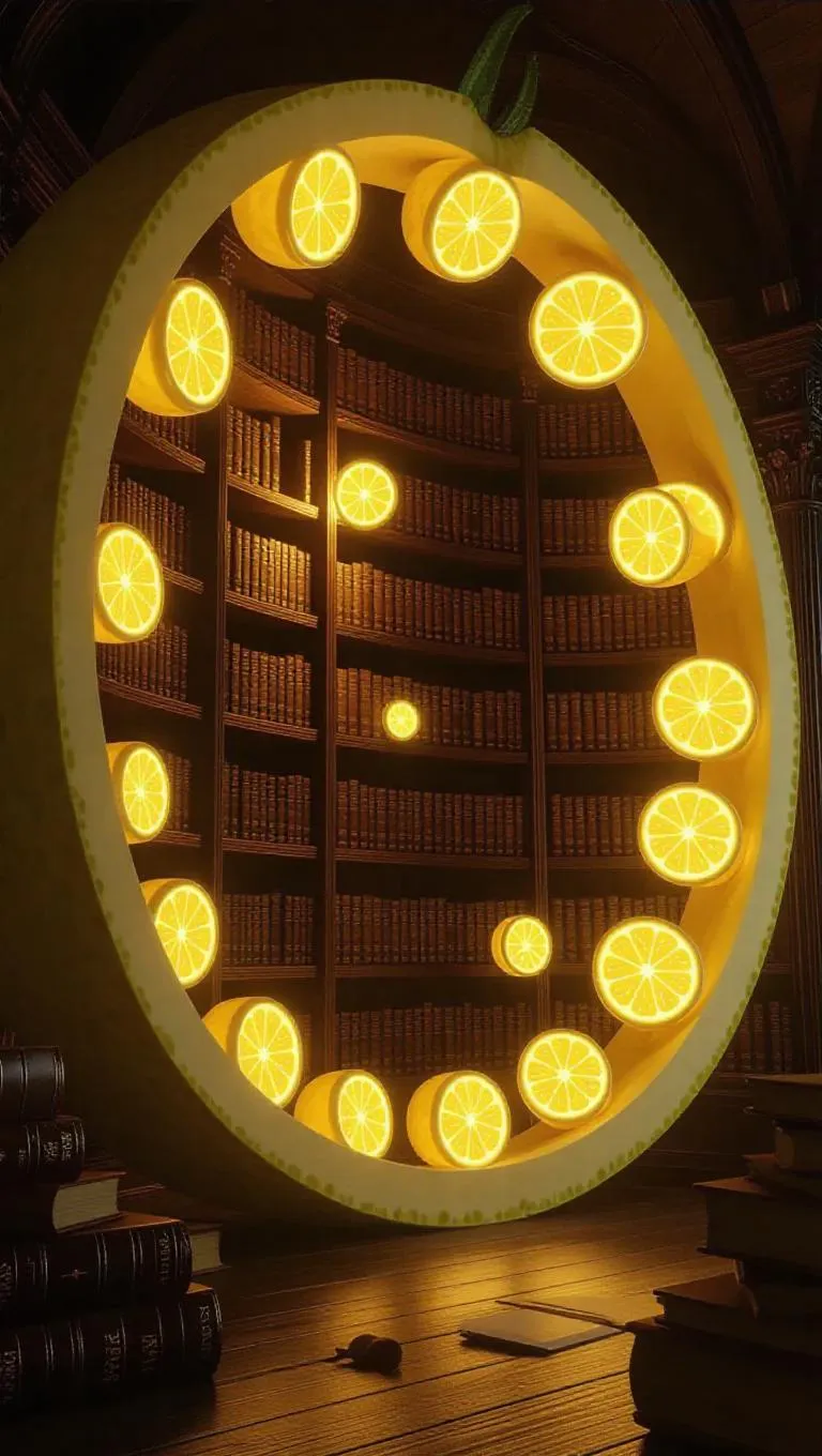 A mystical library housed within a giant lemon peel, illuminated by glowing fruit scrolls that emit a soft, ethereal light. Flying bookworms sip nectar from the scrolls, creating a whimsical and enchanting atmosphere. The walls are lined with ancient tomes and intricate carvings, enhancing the magical ambiance.