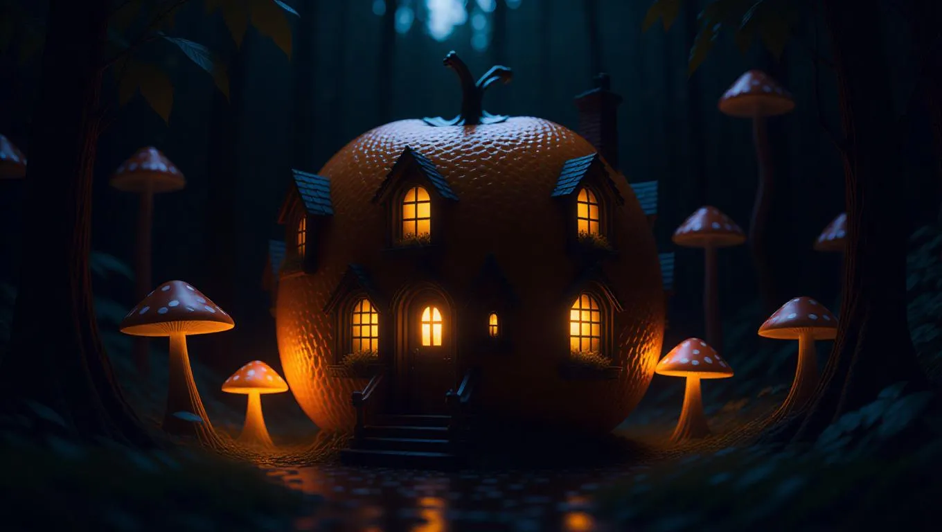 A whimsical house intricately carved from a giant orange, windows glowing warmly at night, surrounded by a dark, mysterious forest, with glowing mushrooms and a whispering wind adding to the eerie ambiance