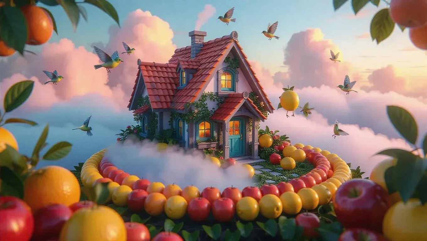 A tranquil cottage nestled in ethereal clouds, encircled by colorful fruit rings and lemon birds serenading with gentle lullabies, creating a whimsical and serene atmosphere