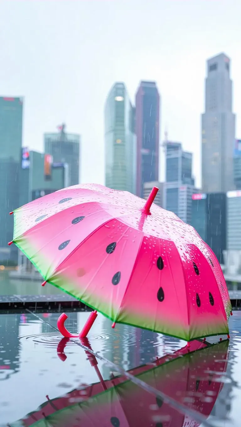 A charming umbrella shaped like a watermelon slice, open under a picturesque light rain, with droplets glinting on its vibrant pink and green surface, set against a modern urban skyline.