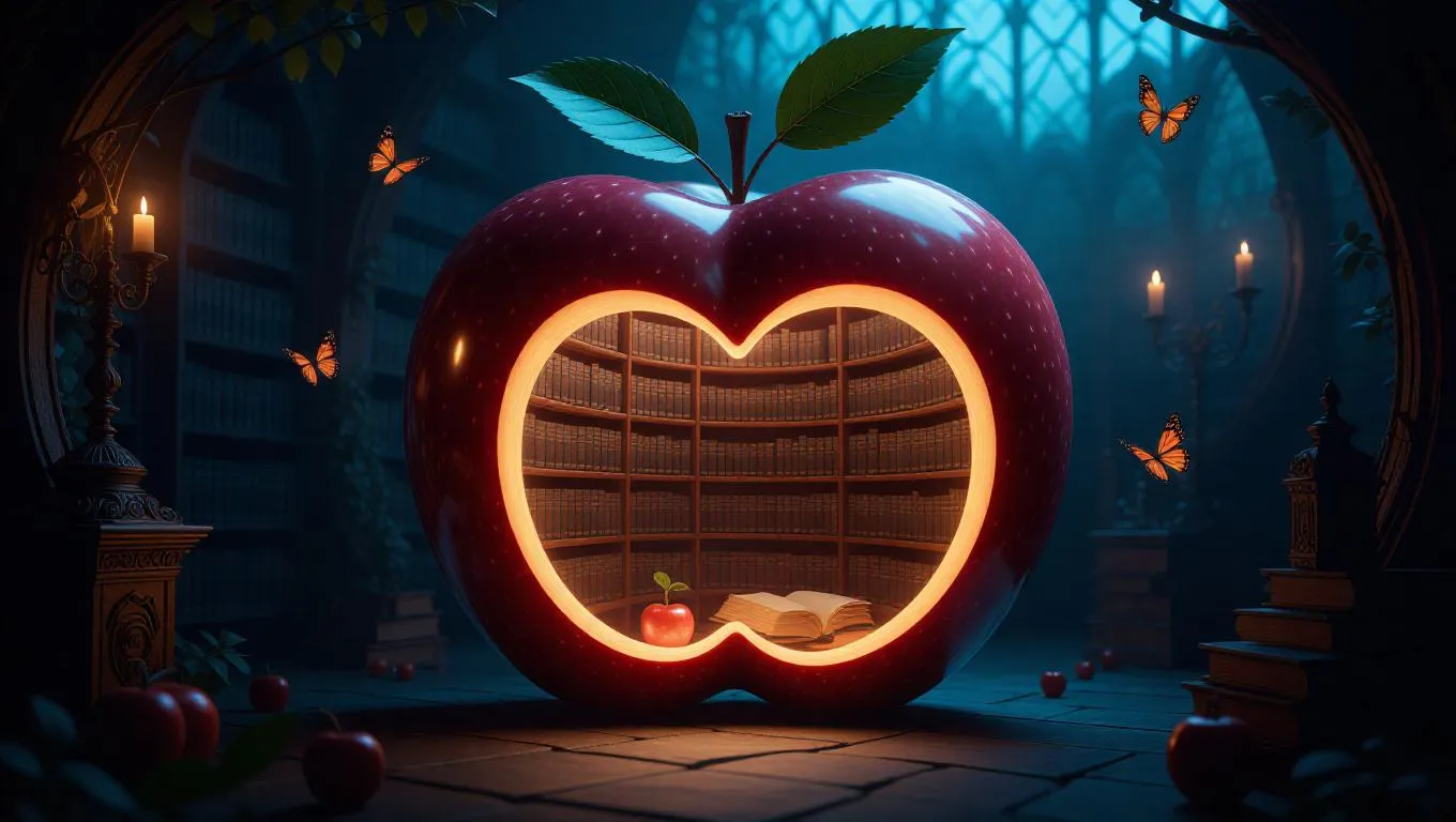 A mystical library nestled within a colossal apple core, illuminated by glowing fruit scrolls that emit a soft, warm light. Flying butterflies sip nectar from the scrolls, creating a whimsical and enchanting atmosphere. The walls are lined with ancient artifacts and intricate carvings, enhancing the magical ambiance.