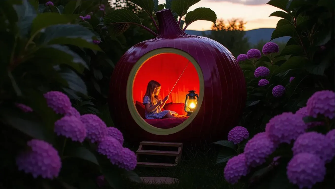 A sleek, Jellycat-style luxury car with soft, rounded edges and large, expressive eyes is parked outside a quaint bakery in a cozy, pastel-colored town. Its body is covered in plush, deep purple fur, with gold paws and a tiny, adorable cupcake on top. The clear blue sky above is dotted with fluffy clouds, and soft, warm sunlight filters through, casting gentle shadows and highlighting the car's cuddly texture. The scene exudes a playful, whimsical charm, perfect for a children's storybook.