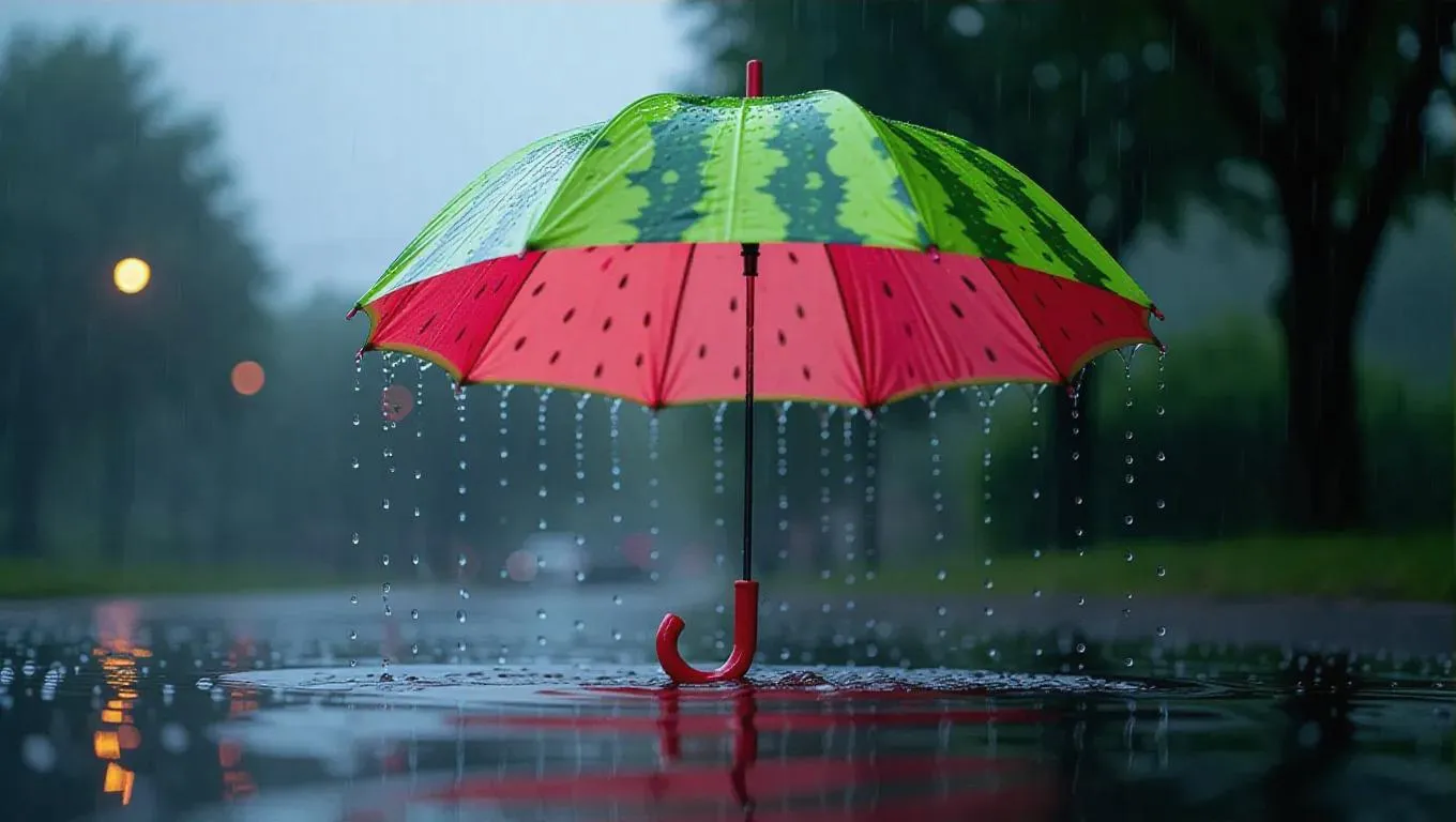 A charming umbrella shaped like a watermelon slice, open under a heavy downpour, with droplets dramatically splashing from its vibrant pink and green surface, set against a gloomy, stormy backdrop.
