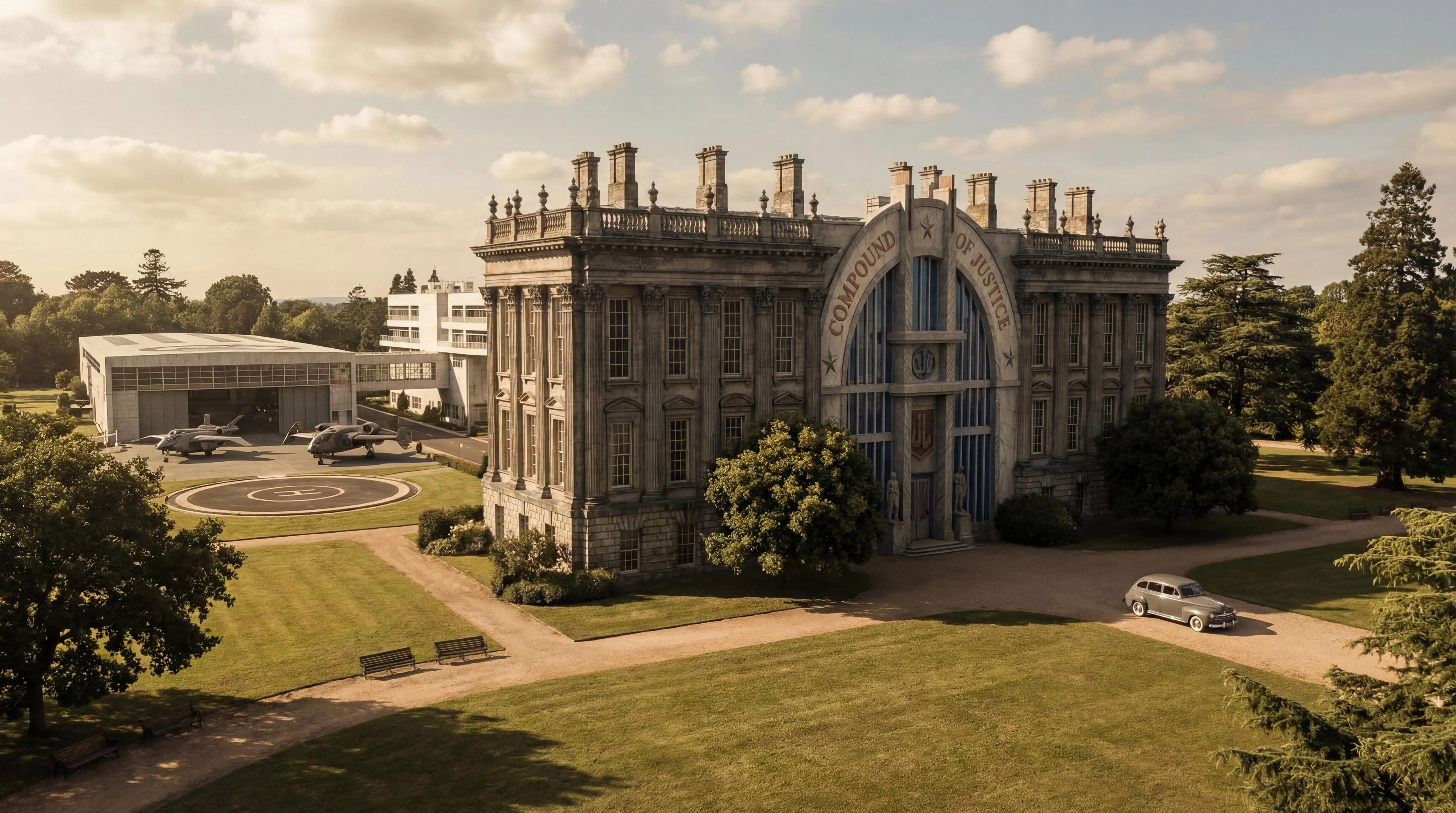 Create AI-generated images of the Compound of Justice: a unique fusion of the D.C.E.U.'s Hall of Justice, Wayne Manor, and the M.C.U.'s Avengers Compound. Located in 1941 Oakland, California. Generate this iconic superhero base mashup with vivago.ai's powerful AI image generation tools.