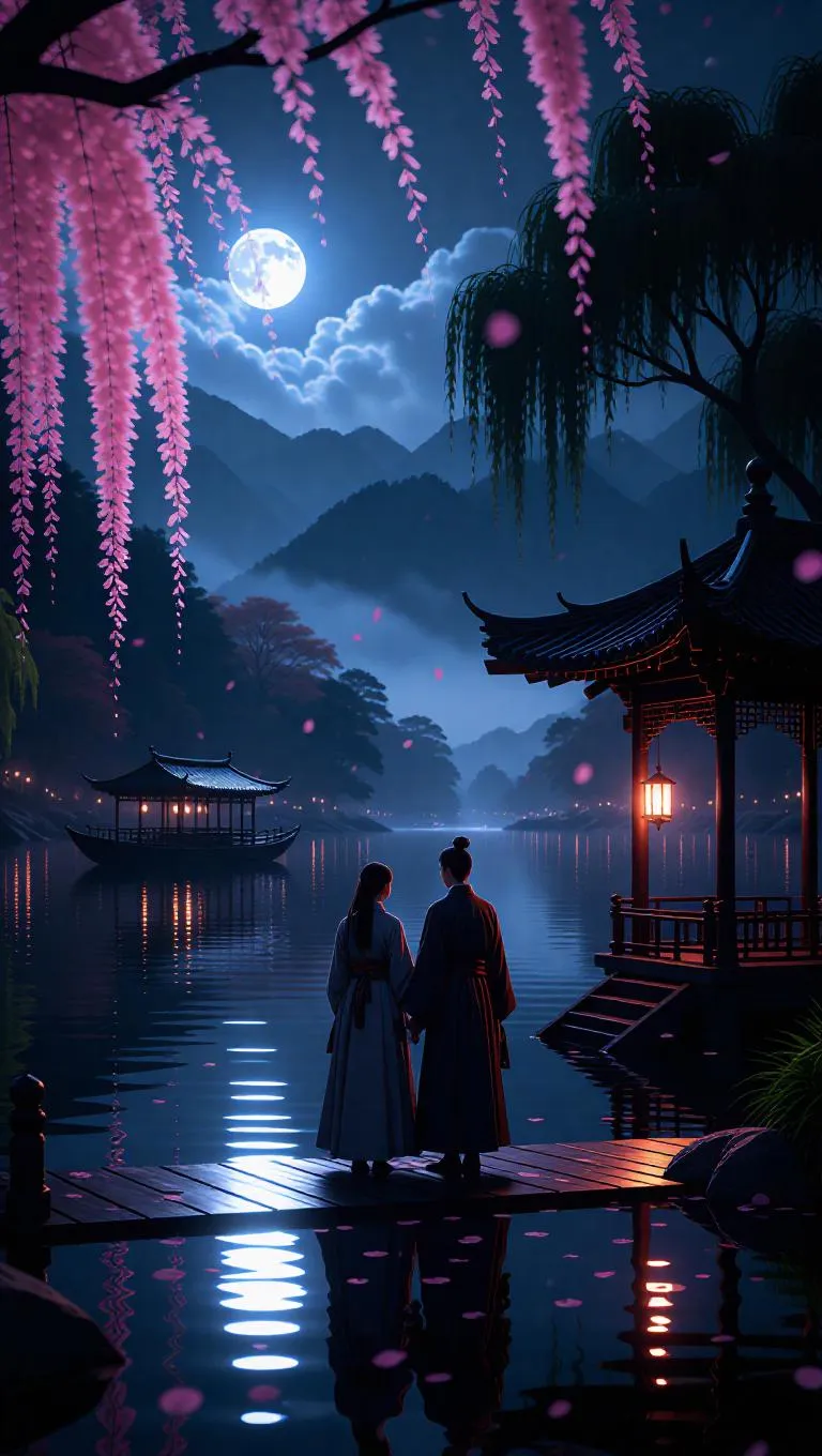 Evoke ancient Chinese aesthetics with this tender farewell scene blending traditional ink painting and soft anime glow. A scholar and woman part at a misty riverside pavilion under a pale moon, drifting petals and tears capturing sorrow. Merges classical Chinese style with new artistic effects—flickering lanterns, fluttering robes, vast riverscapes in harmonious tradition-meets-modern visual poetry.