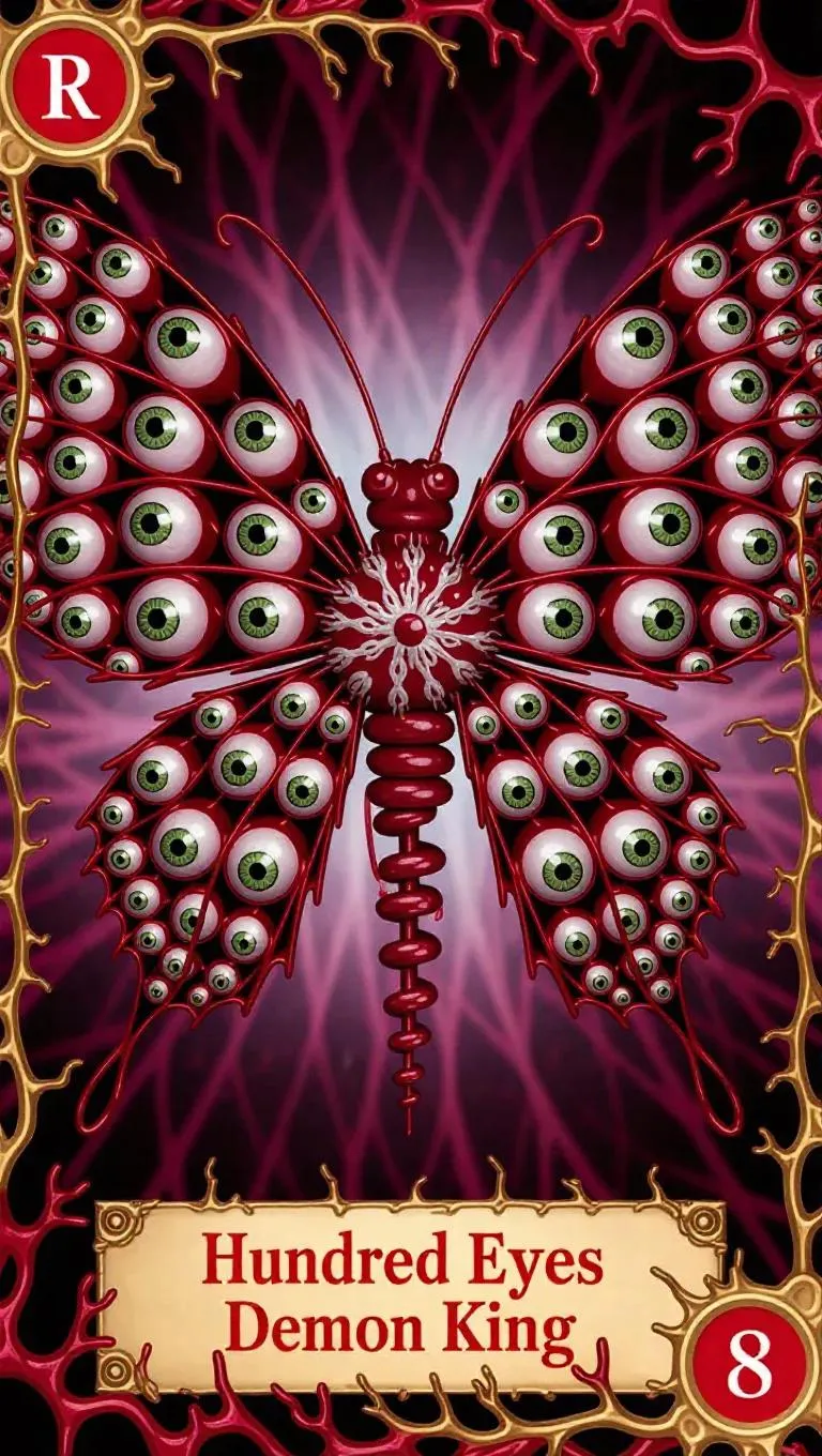 Unleash surreal horror with this AI-generated "Hundred-Eyed Demon Lord" card art. Features kaleidoscopic hellscapes in 100 iris-engraved wings, glowing amber sinew anatomy, and occult spinal relics. Cinematic lighting enhances the vascular Sanskrit border textures and corroded copper typography. Professional 4K creature design using JuggernautXL's subsurface scattering for maximum eldritch impact. Avoids simplistic styles with premium texturing.