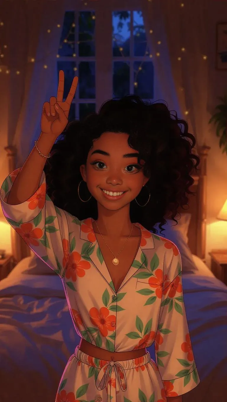 Create vibrant Instagram cartoon art with vivago.ai's AI image generator. Turn text prompts into aesthetic visuals of a young Black woman waving, smiling with a peace sign in a cozy nighttime bedroom. Ideal for vlogs, our AI tools deliver professional-grade PJ-clad characters and dreamy backgrounds for standout social media content.