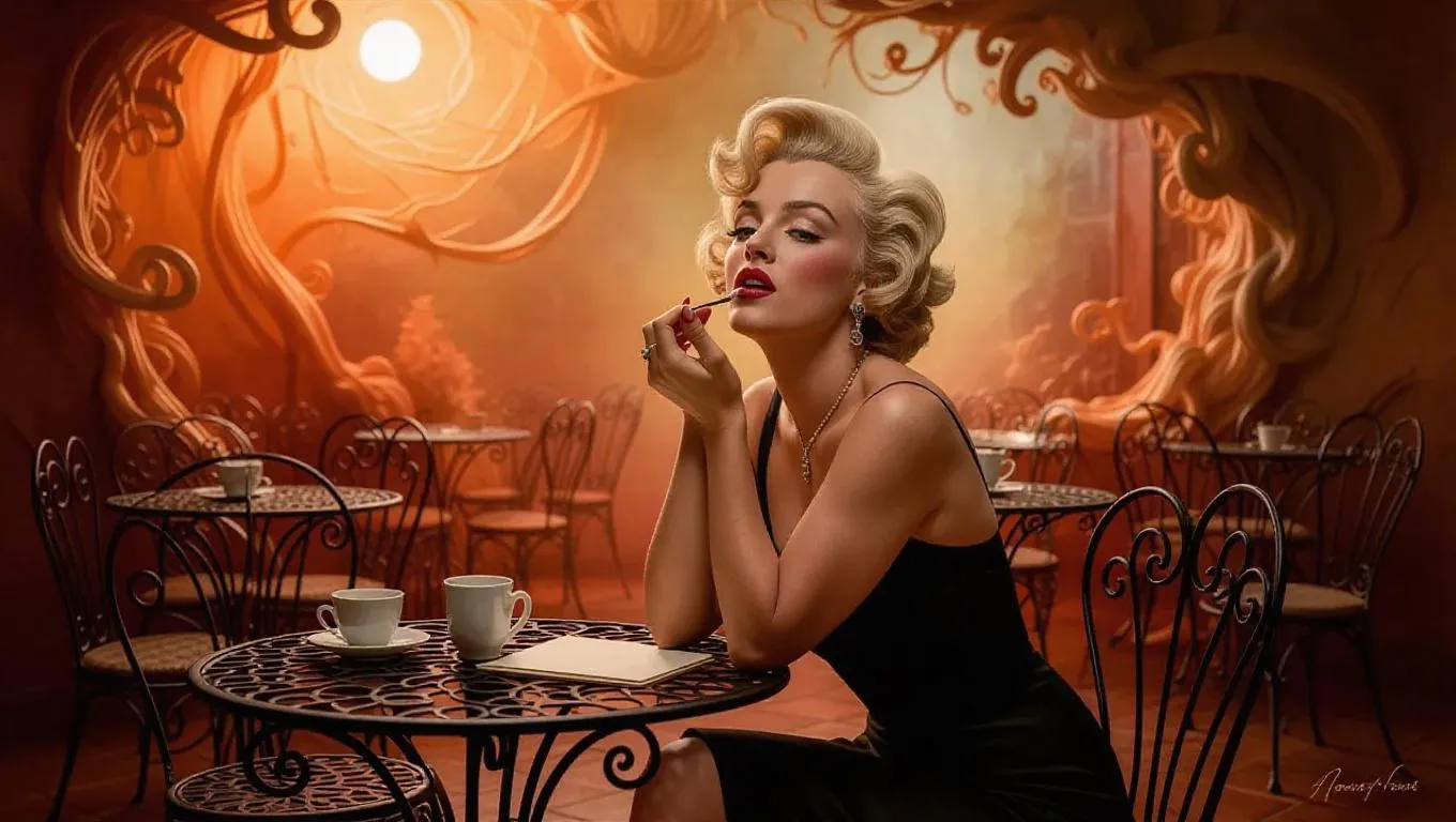 Generate a vivid impasto oil painting blending Alphonse Mucha, Jeremy Mann, and Heinrich Kley's styles, depicting Marilyn Monroe in an Italian café. Capture her "Teen Angst" posture mid-makeup with textured strokes, cosmic warm hues, and subtle anthropic decay. Inspired by Gammell, Goldin, and Gerome, soft lighting highlights emotional depth and ethereal beauty. Create AI-driven artistry with Vivago.ai's tools.
