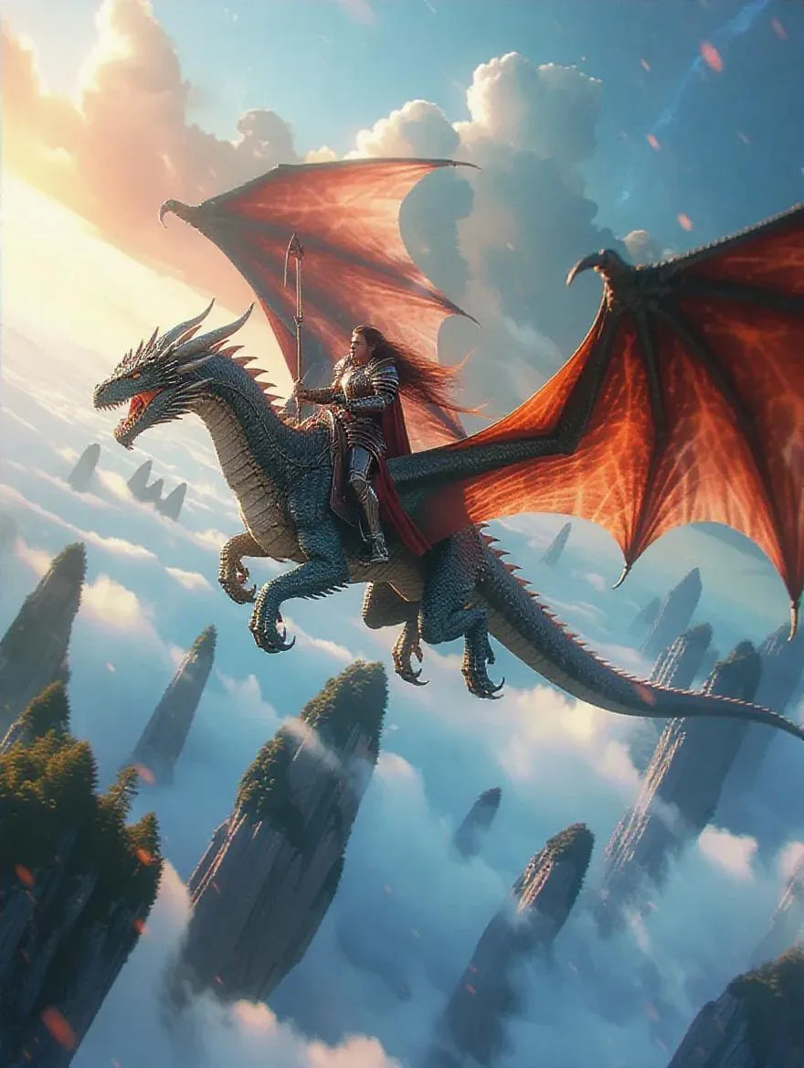 Create stunning AI-generated fantasy art of a mighty warrior riding a majestic dragon soaring above ethereal floating islands. Shimmering magic trails, swirling bright clouds, and a dramatic high-angle shot bring this epic fantasy landscape to life. Transform your vision into mesmerizing visuals with VivaGo AI's AI image generator.