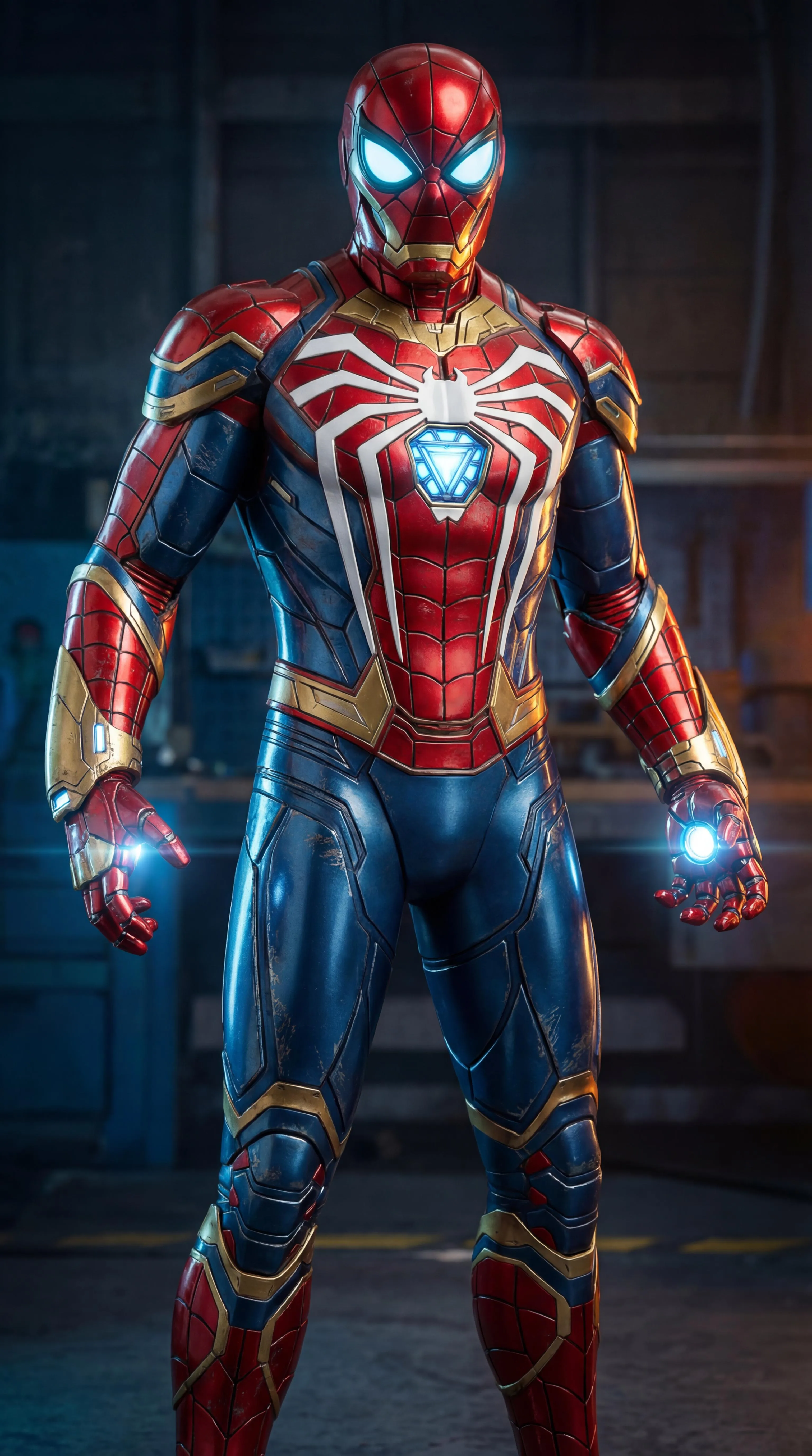 The Invincible Iron Man and the Insomniac Spider-Man (voiced by Yuri Lowenthal) combined together as Iron-Spider. In accordance with this fusion, the red portions on both characters' suits combine together and both combine and feature the web designs on Spider-Man's two suits as one, the blue parts on Spider-Man's two suits combine as one, the gold sections on Iron Man's two armors combine as one, the eye slits on Spider-Man's two suits combine with the lit-up eye slit-like features on the masks of Iron Man's two armors, the front spider logos on Spider-Man's two suits combine as one and feature the glowing chest pieces of Iron Man's two armors combined as one in the center, and the glowing palm-based repulsor nodes on Iron Man's two armors are combined as one on the gauntlets.