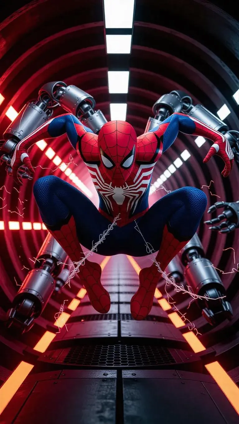 32K Thick Paint CG of Spider-Man entangled with a massive robotic enemy in a subway tunnel, hyper-detailed webbing wrapping around mechanical limbs, energy sparks from suit's web shooters, cinematic tunnel lighting casting long shadows and highlights on suit's red accents, RGB Color Mode contrasting cool silver robot vs. warm red webbing, 350 dpi resolution for metal texture on robot and webbing slime details, empty space at tunnel ends to emphasize scale. Negative Prompt: Unrealistic robot proportions, cartoonish webbing, 2D tunnel perspective, color mismatch, overly simplistic suit damage, low-tech visual effects.