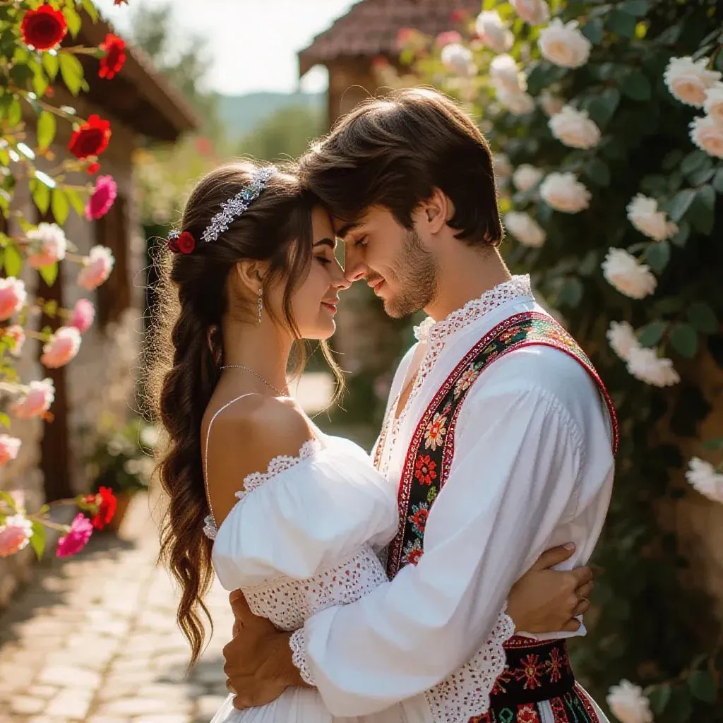 Create AI-generated romantic visuals of a couple in traditional Romanian costumes embracing in a rose-filled park alley. Perfect for summer love scenes with intricate embroidered shirts, vibrant floral backdrops, and serene blue skies. Craft lifelike images using Vivago.ai's AI tools for authentic cultural and emotional storytelling.