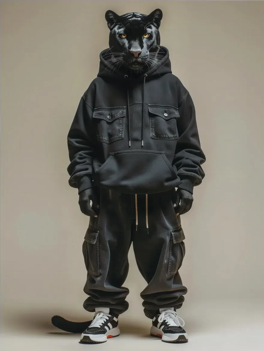 Generate hyperrealistic AI art of an anthropomorphic black panther standing tall in stylish streetwear. Create full-body digital art of this bipedal animal character with a neutral background. Use AI image generation for professional-grade anthropomorphic animal art and creative character design.