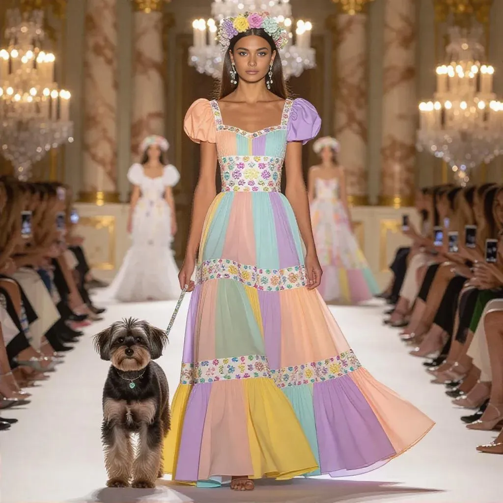 Paris fashion runway merges haute couture with ancient Greek Easter traditions. Model in pastel balloon-sleeve dress & floral crown walks alongside her Kokoni dog in matching attire, adorned with Easter egg motifs and wild blooms. Serene yet bold ambiance blends modern elegance with Hellenic heritage for a timeless, AI-generated visual narrative.