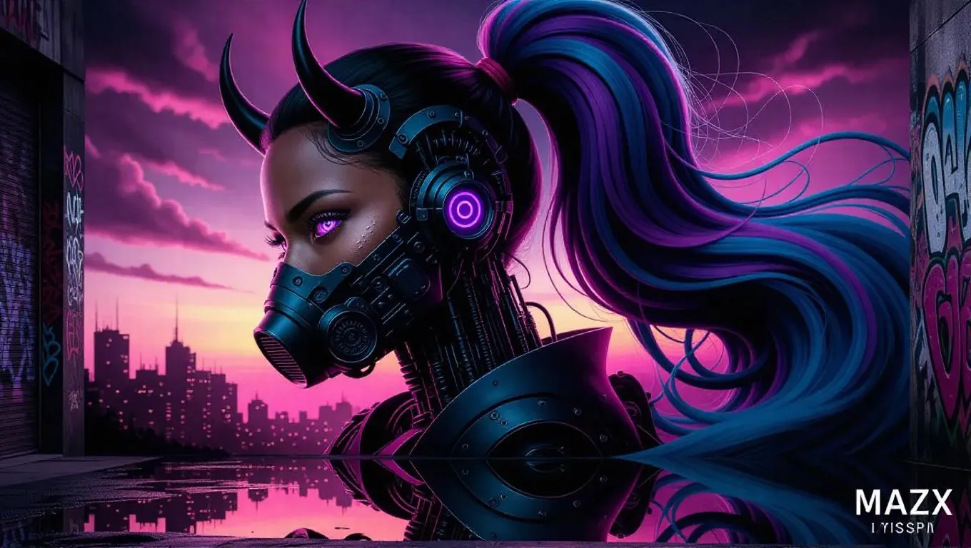 A mural adorns a weathered alley wall, featuring a dark-skinned female cyborg with oni horns and a respirator mask, her glowing violet eyes piercing through a dynamic side profile. Neon-lit mechanical parts intertwine with her multicolored hair, cascading in a high ponytail against a gradient of cyberpunk-purple and electric-blue skies. Ethereal energy swirls around her, blending sci-fi fierceness with ethereal magic as reflections ripple in rain-soaked puddles below. Soft anime aesthetics wash the scene in muted greys and blush pinks, contrasting sharp cybernetic details with dreamlike brushstrokes. Cinematic lighting highlights the textured concrete, framing the figure in a dramatic upper-body composition that merges dystopian grit with melancholic romance.
