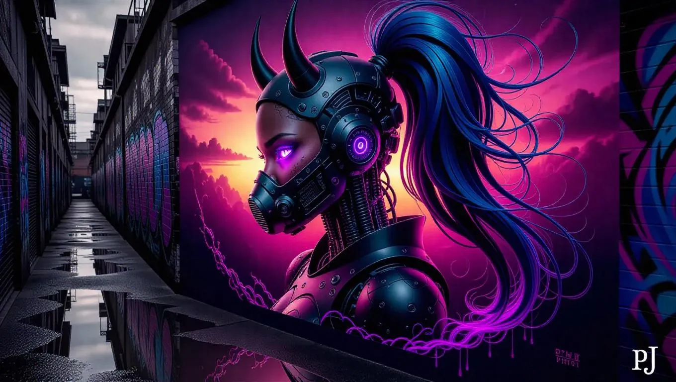 A mural adorns a weathered alley wall, featuring a dark-skinned female cyborg with oni horns and a respirator mask, her glowing violet eyes piercing through a dynamic side profile. Neon-lit mechanical parts intertwine with her multicolored hair, cascading in a high ponytail against a gradient of cyberpunk-purple and electric-blue skies. Ethereal energy swirls around her, blending sci-fi fierceness with ethereal magic as reflections ripple in rain-soaked puddles below. Soft anime aesthetics wash the scene in muted greys and blush pinks, contrasting sharp cybernetic details with dreamlike brushstrokes. Cinematic lighting highlights the textured concrete, framing the figure in a dramatic upper-body composition that merges dystopian grit with melancholic romance.