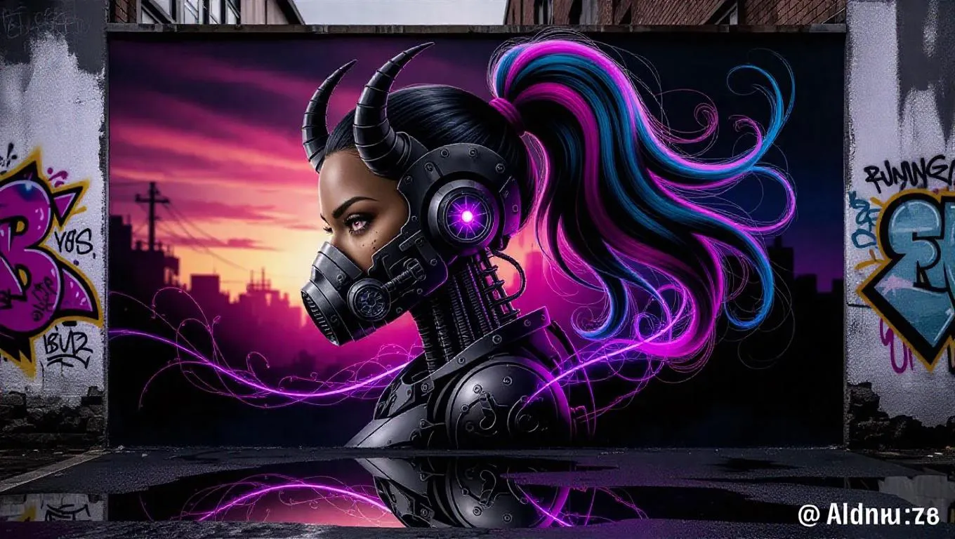 A mural adorns a weathered alley wall, featuring a dark-skinned female cyborg with oni horns and a respirator mask, her glowing violet eyes piercing through a dynamic side profile. Neon-lit mechanical parts intertwine with her multicolored hair, cascading in a high ponytail against a gradient of cyberpunk-purple and electric-blue skies. Ethereal energy swirls around her, blending sci-fi fierceness with ethereal magic as reflections ripple in rain-soaked puddles below. Soft anime aesthetics wash the scene in muted greys and blush pinks, contrasting sharp cybernetic details with dreamlike brushstrokes. Cinematic lighting highlights the textured concrete, framing the figure in a dramatic upper-body composition that merges dystopian grit with melancholic romance.