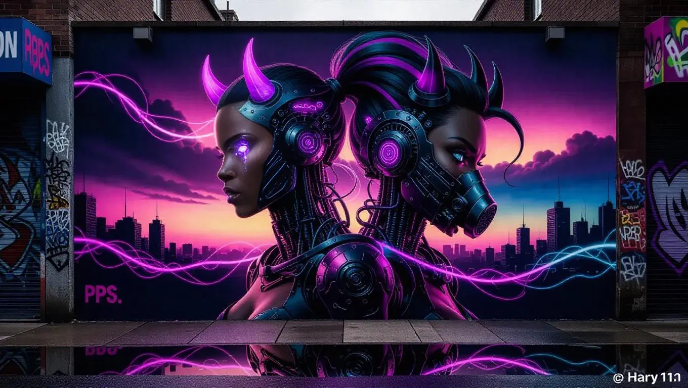 VivaGo AI generates cyberpunk murals blending neon-lit cyborgs with ethereal magic. Create dark-skinned female figures with oni horns, respirator masks, and glowing violet eyes amid rain-soaked dystopian alleys. Merge anime aesthetics, sci-fi mechanical details, and electric-blue gradients with cinematic lighting. Craft melancholic romance through textured concrete, dynamic compositions, and dreamlike brushstrokes in AI-powered professional visuals.