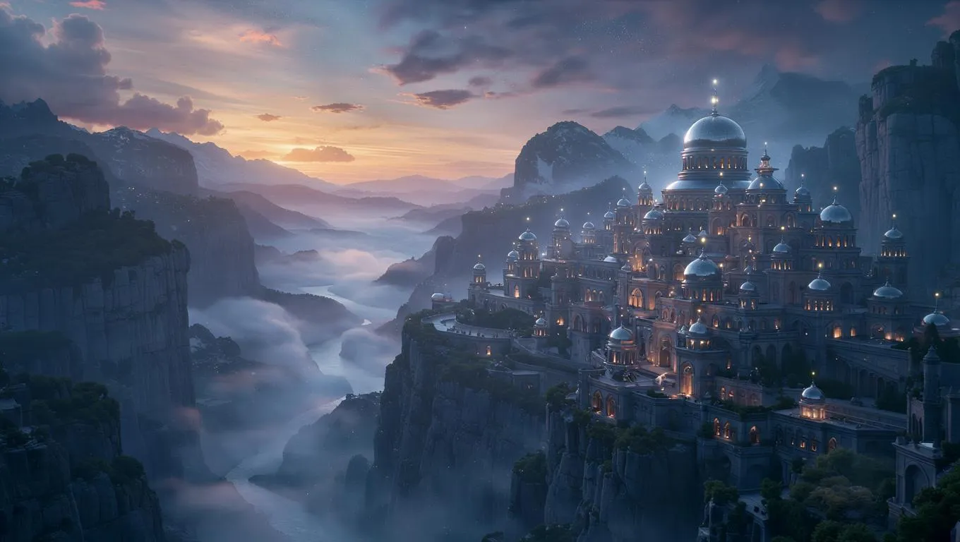 Wide aerial shot of the mountain city at twilight, silver domes sparkling along the cliffs like scattered stars, mist flowing through valleys below, grand terraced skyline glowing with magical ambiance, OC rendering, UE5 effects, particle light effects