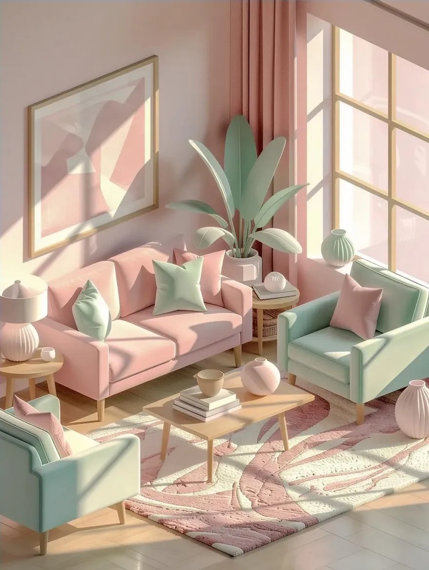 An isometric 3D cube cutout of a modern pastel-toned living room, rendered in cinematic quality with ray tracing. Plush furniture in muted rose, mint, and cream hues complements sleek wooden textures and mid-century modern decor. Layered rugs add tactile depth, while large isometric windows cast soft-edged shadows and warm highlights. Every detail, from book spines to ceramic vases, exudes care and realism. The soft ambient lighting enhances natural reflections, creating a dreamy, serene atmosphere suitable for concept art on ArtStation or Behance.