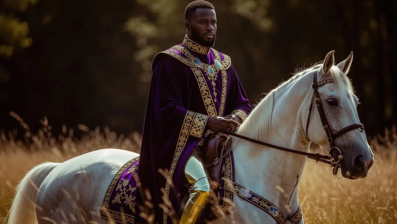 Hyperrealistic AI-generated image of a black man on a milk-white horse with royal purple saddle, clad in gold-black robes and golden shoes. Dune-inspired cinematic realism blends despair, evil smile, and bright pupils under cold light. Features film grain, tied silver hair, and dual-view angles for professional-grade visual storytelling.