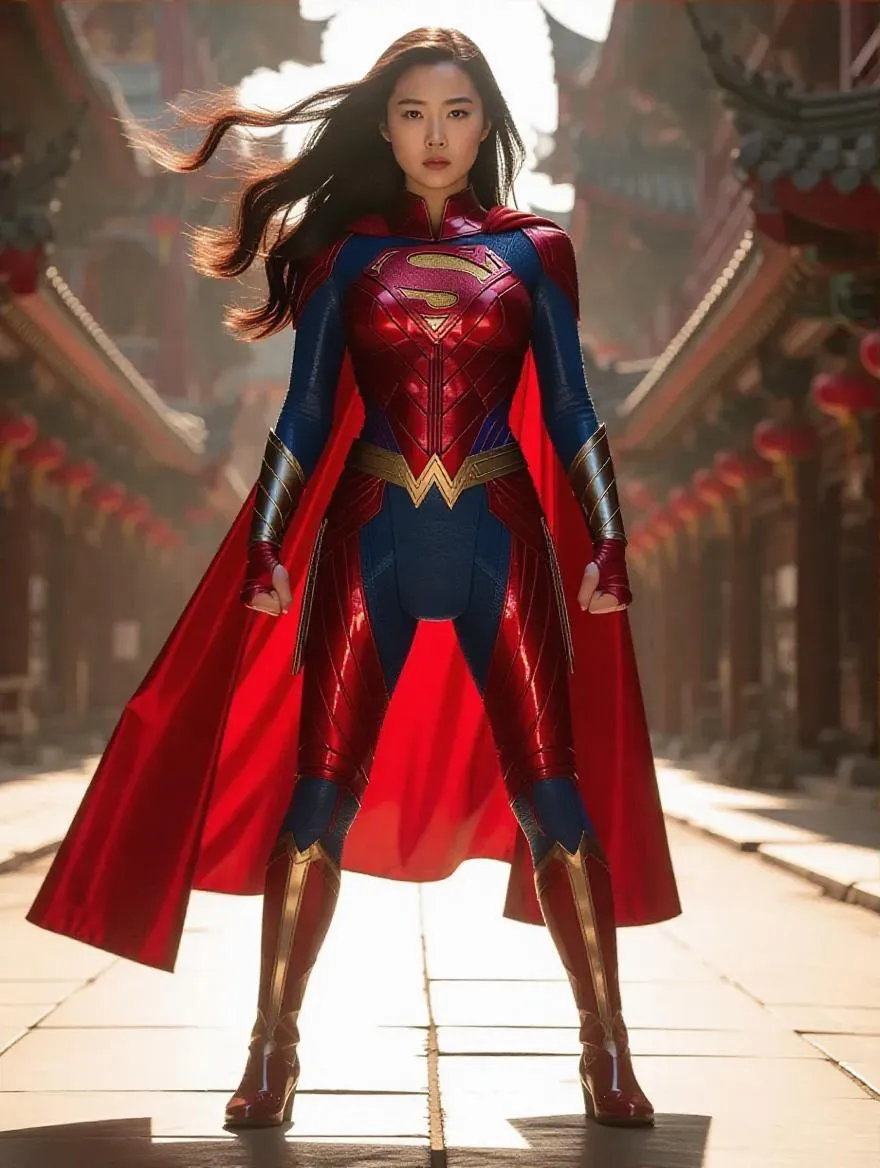 Experience AI-generated superheroine visuals with CN GIRL: a powerful Chinese superwoman in red-blue krypton fiber tights, wielding a diamond shield, flowing red cloak, and knee-high boots. Vivago.ai crafts dynamic 4K HDR (60 FPS) imagery, blending live-action detail with AI effects for striking, professional-grade results. Elevate creative projects with this bold fusion of cultural inspiration and cutting-edge AI innovation.