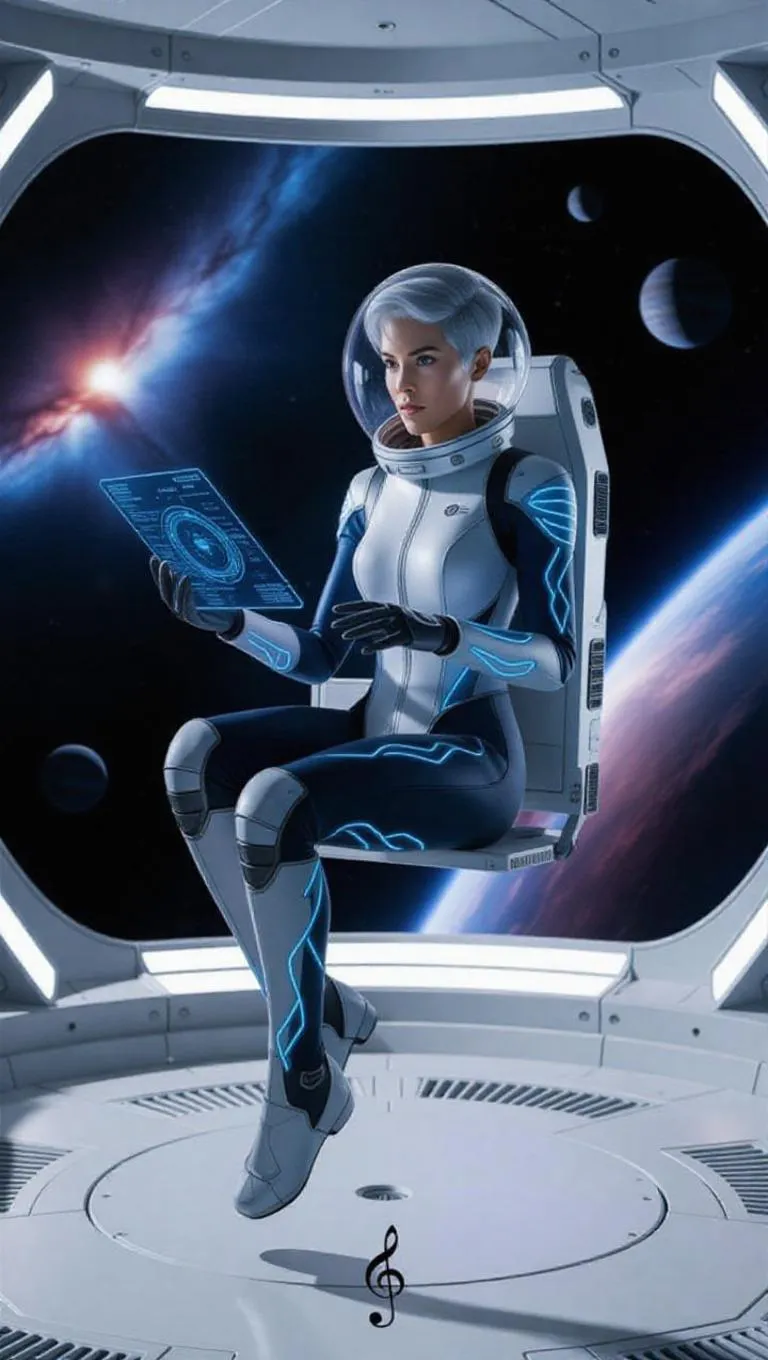 Generate stunning AI space art: Futuristic interstellar explorer floats in zero-gravity. Nebula & orbiting planets backdrop. Sleek silver hair, form-fitting white suit with glowing blue nano-patterns. Transparent helmet, calm curiosity. Holds holographic star map. Cool white, deep blue, silver palette. High-tech, minimalist details emphasize space vastness. Create with Vivago.ai art creator.
