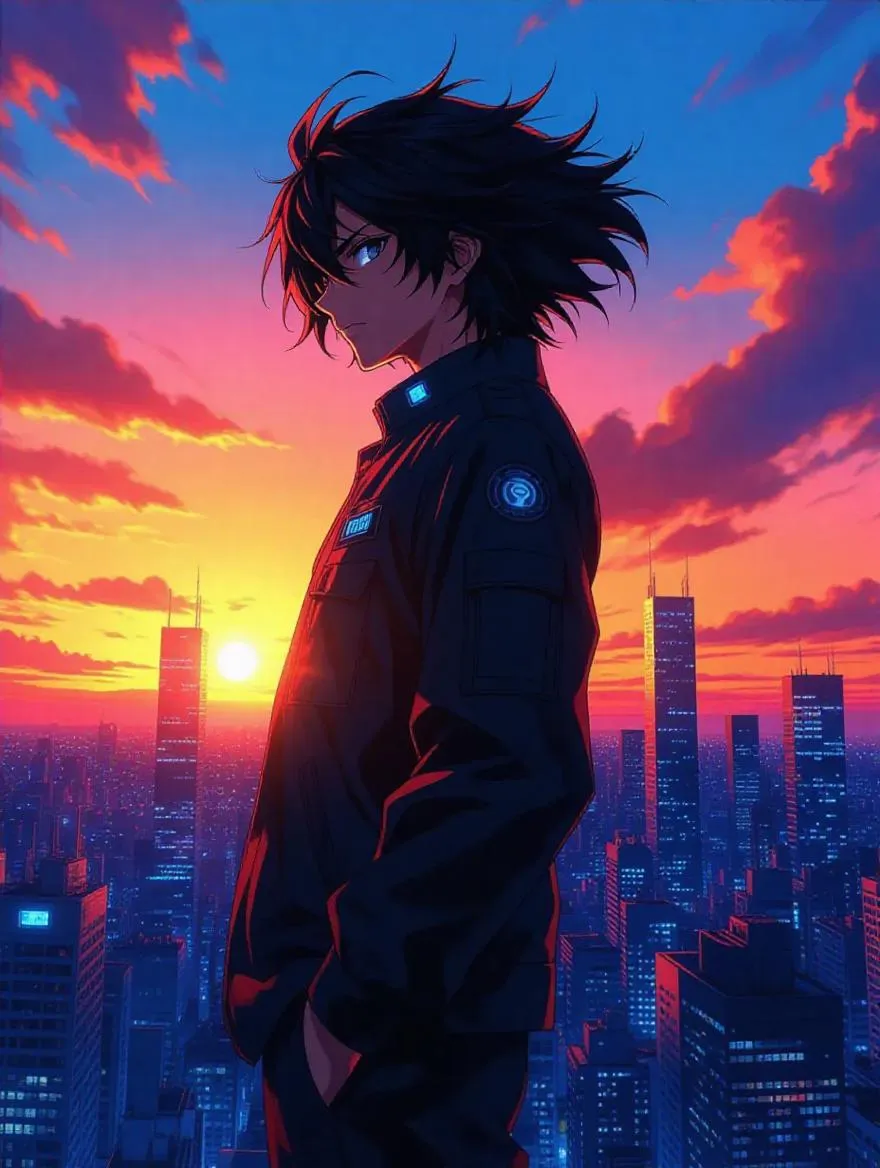 A vibrant anime scene featuring a dynamic hero with flowing hair, intense eyes, and a determined expression, standing atop a futuristic cityscape at sunset. The hero is surrounded by glowing neon lights and towering skyscrapers, with a sense of epic adventure and anticipation in the air.