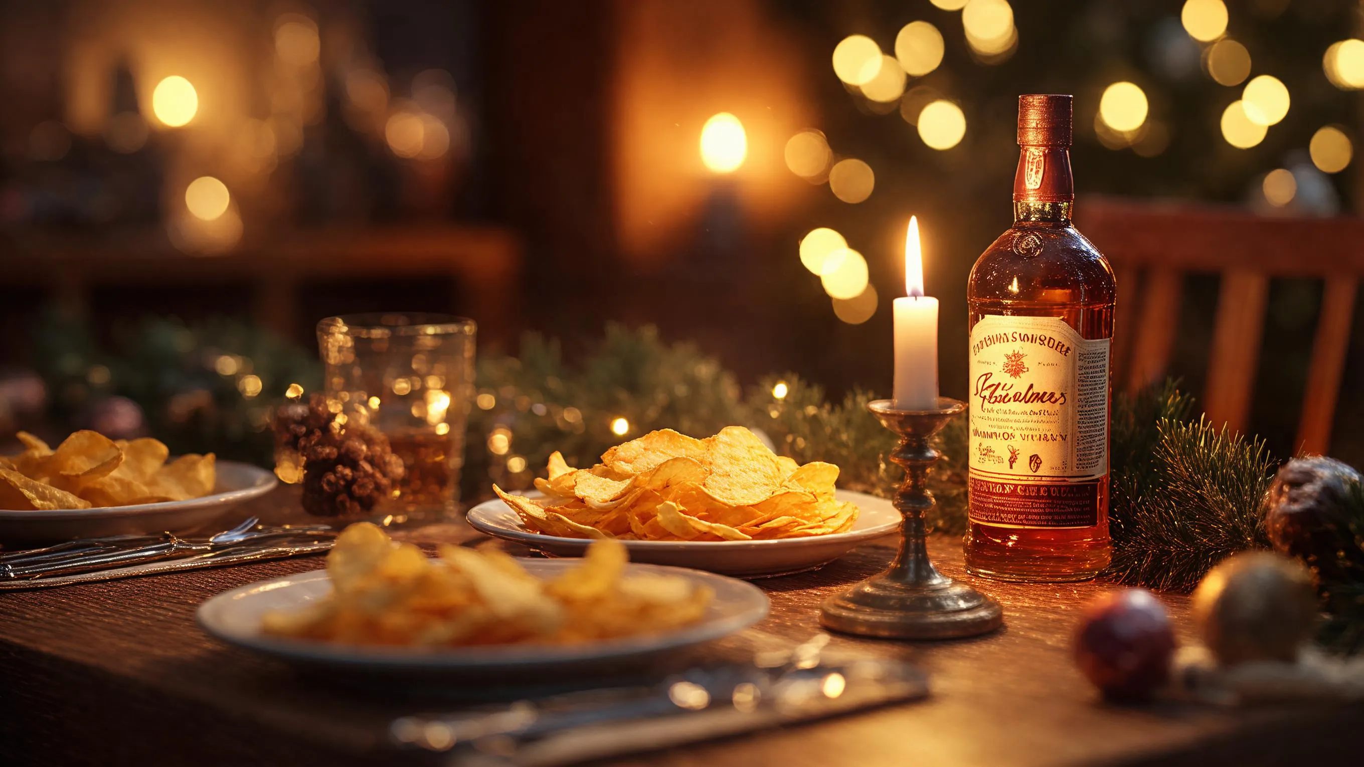A cozy Christmas table features a flickering candlestick casting warm, ambient light, a bottle of whisky, and plates filled with crispy chips. The scene is set in a warmly lit room, with soft, golden hues enhancing the festive atmosphere. The candlelight adds a gentle, inviting glow, creating a sense of warmth and comfort. The style is realistic, capturing the essence of a joyful holiday gathering.