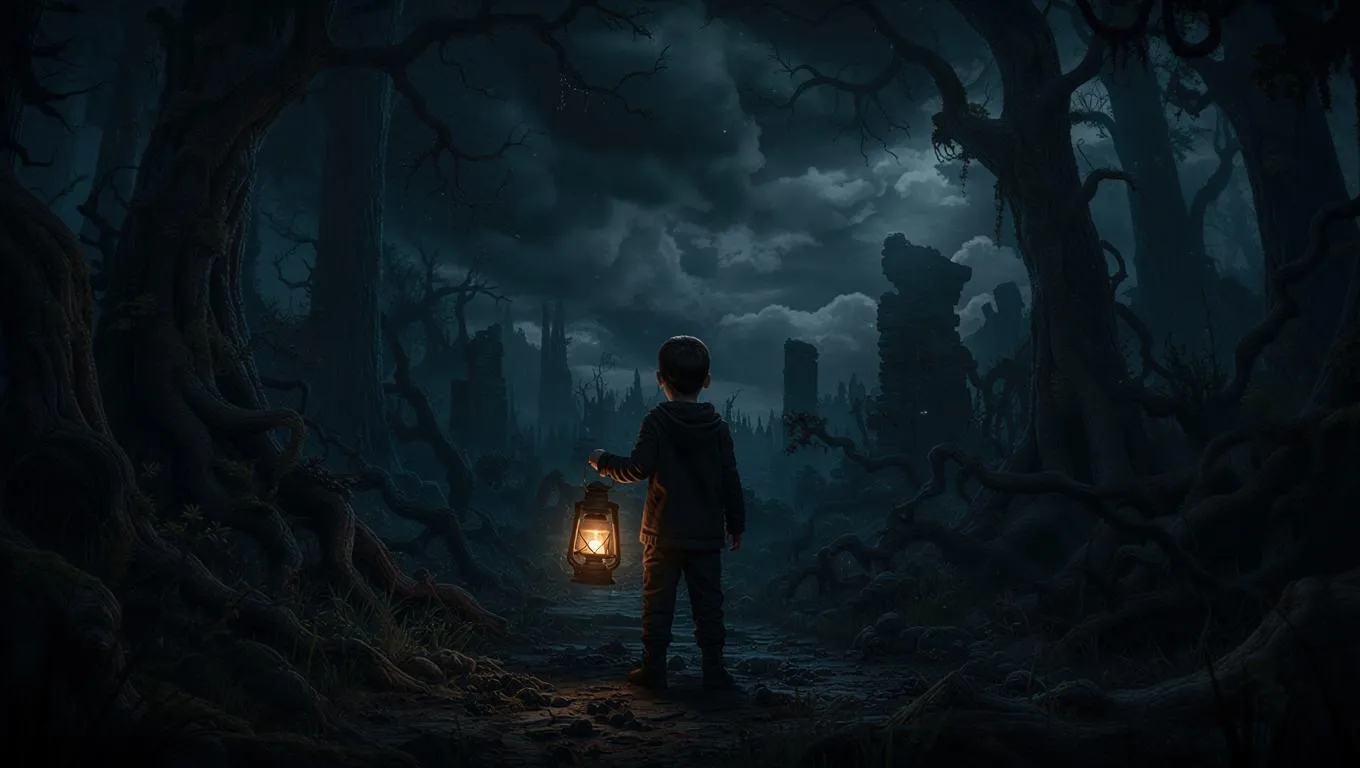 Experience an eerie night scene with a boy holding a lantern amidst dark forest monsters. Create this stunning AI-generated art & supernatural atmosphere visualization using vivago.ai's tools. Transform your "dark clearing prompt" into professional, ominous visuals quickly. Perfect for generating stunning AI visuals.