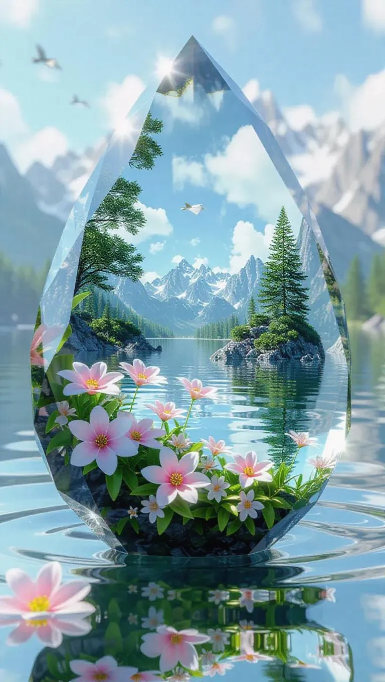 Generate hyper-realistic AI art with Vivago.ai: surreal crystal flower structure encasing a vibrant tropical forest, exotic animals, and flowing water. Inspired by M.C. Escher and Ernst Fuchs, this Fauvist masterpiece blends intricate details with a stark white backdrop, emphasizing vivid colors within the crystal. Transform prompts into professional-grade visuals using AI-powered creativity.