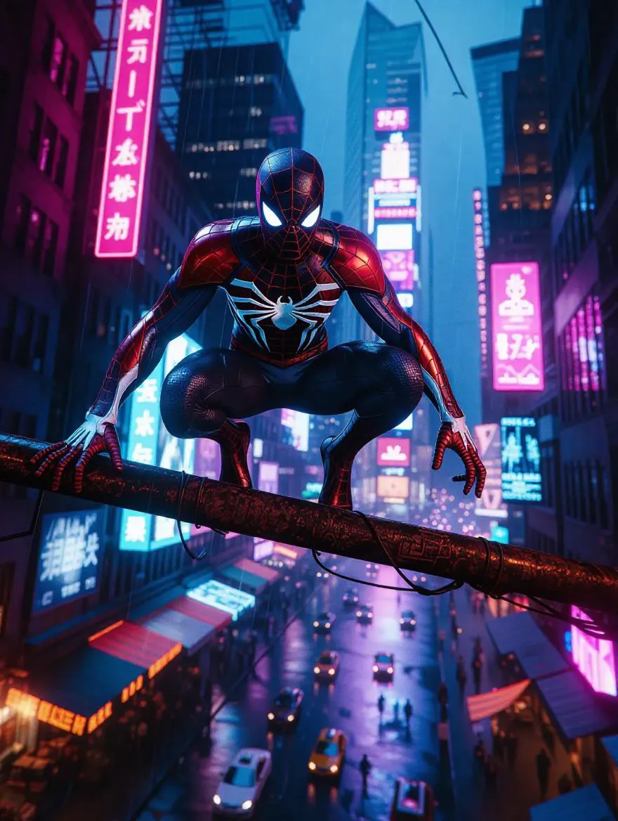 A futuristic cyberpunk metropolis pulses with neon-lit skyscrapers, holographic billboards flickering in the rain-soaked air. Spider-Man perches atop a rusted steel beam, his nano-tech suit glowing with pulsating cyan circuitry and crimson accents, adaptive armor plates shifting dynamically. Below, levitating cars weave through floating market stalls, augmented humans and drones crowd the smoggy streets. Dramatic backlighting casts his dynamic pose in silhouette against a colossal hologram of a snarling corporate logo, glowing spider-silk threads trailing into the electric-blue haze. Ultra-detailed 8K, cinematic wide-angle shot with lens flare and motion blur from passing hoverbikes, blending dystopian grit with hyper-modern sleekness.