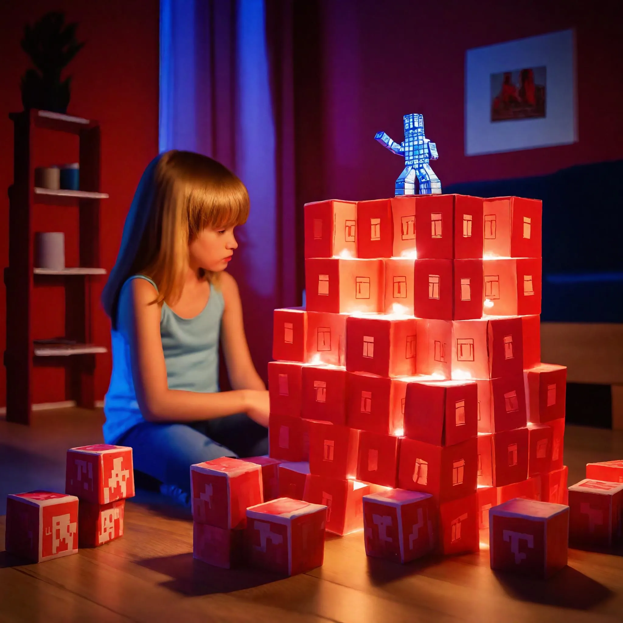 A photorealistic scene in a cozy child’s bedroom during late evening, lit only by a warm desk lamp. On the wooden floor stands a large toy house or castle built entirely from handmade paper blocks styled like Minecraft TNT — red paper cubes with hand-drawn 'TNT' labels, slightly crumpled edges showing childlike craft. At the top of the structure sits a Barbie doll in a sparkling pink dress, long blonde hair flowing as if guarding the tower. The 7-year-old boy in pajamas leans in close, holding a toy lighter. One of the paper TNT blocks has caught fire — small flames and bright sparks shoot out like a safe fireworks display. The boy’s face glows in the orange light, his eyes wide with awe. A faint trail of smoke rises into the air. The Barbie doll remains seated on top of the structure, catching some of the sparks. The mood is playful yet surprisingly dramatic, captured at child-eye level in hyperrealistic style.