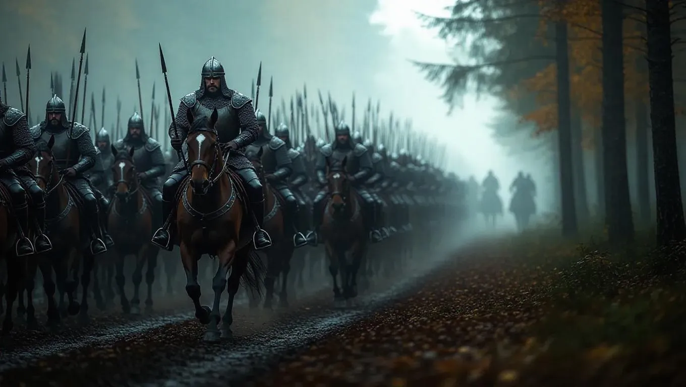 Weathered medieval Slavic warriors march cautiously through an ancient forest path. Soldiers bearing spears, swords, axes, and maces scan unfamiliar terrain. Period-accurate gear details enhance the historical scene. Mounted knights lead the column. AI image generator effect crafted by Vivago.ai.