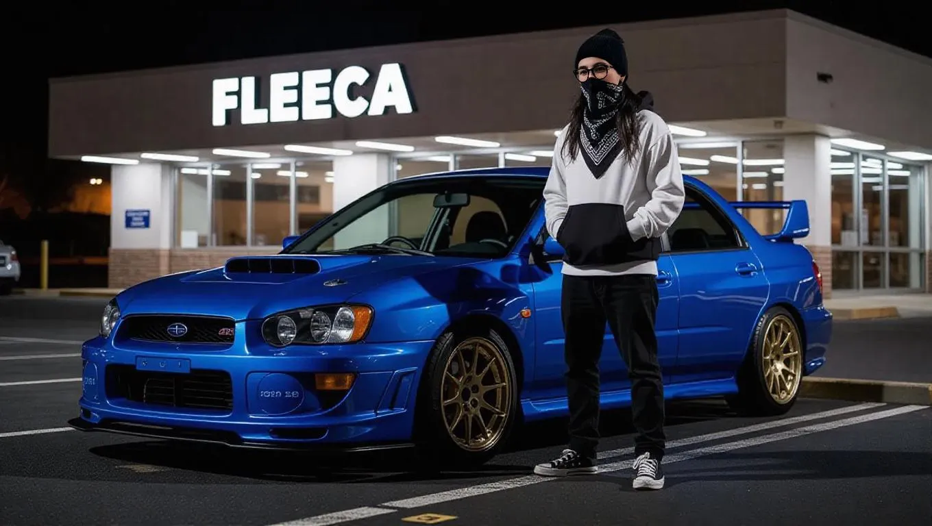 Generate this dark cyberpunk character: man with emo hair, beanie, bandana, hoodie & rectangle glasses near a blue Subaru STI. Standing in a night parking lot by a glowing FLEECA bank sign. HD shadows & cinematic AI art created with vibrant 4K detail. Professional AI character generator tool for unique night scene creator visuals.