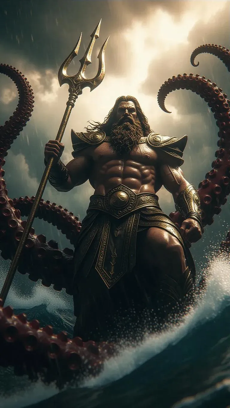 Generate hyper-realistic 4K AI imagery of Poseidon, the Greek sea god, commanding stormy oceans astride a colossal Kraken. Cinematic visuals showcase his bronze armor, divine trident, and swirling sea creatures amidst crashing waves and thunderous skies. Unleash mythological power with AI-generated art blending dynamic lighting, intricate details, and divine fury for epic digital creations.