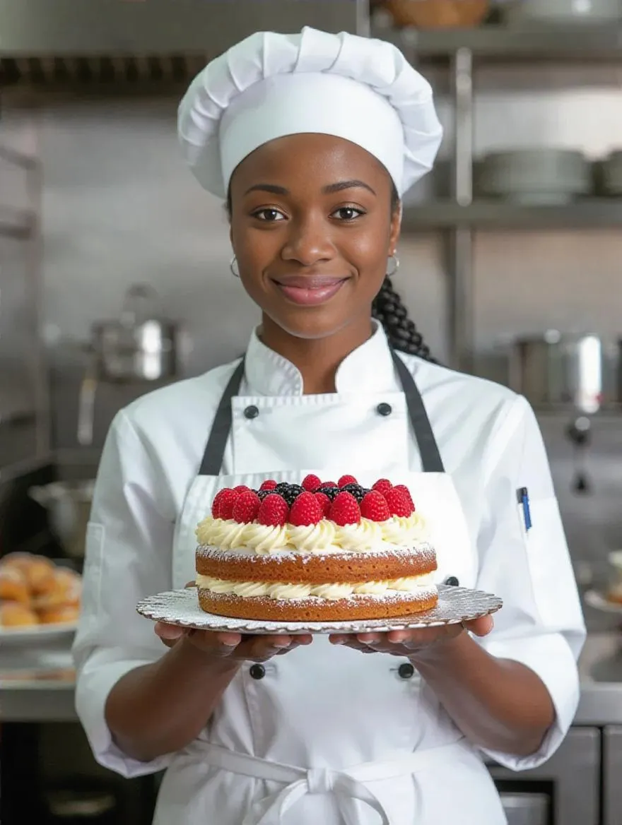 Generate an AI image of an African pastry chef holding a cake using vivago.ai. Transform text prompts into professional visuals instantly. Customize details like skin tone, attire, and cake design with our AI image generator for high-quality, culturally authentic results. Perfect for culinary branding or social media content.