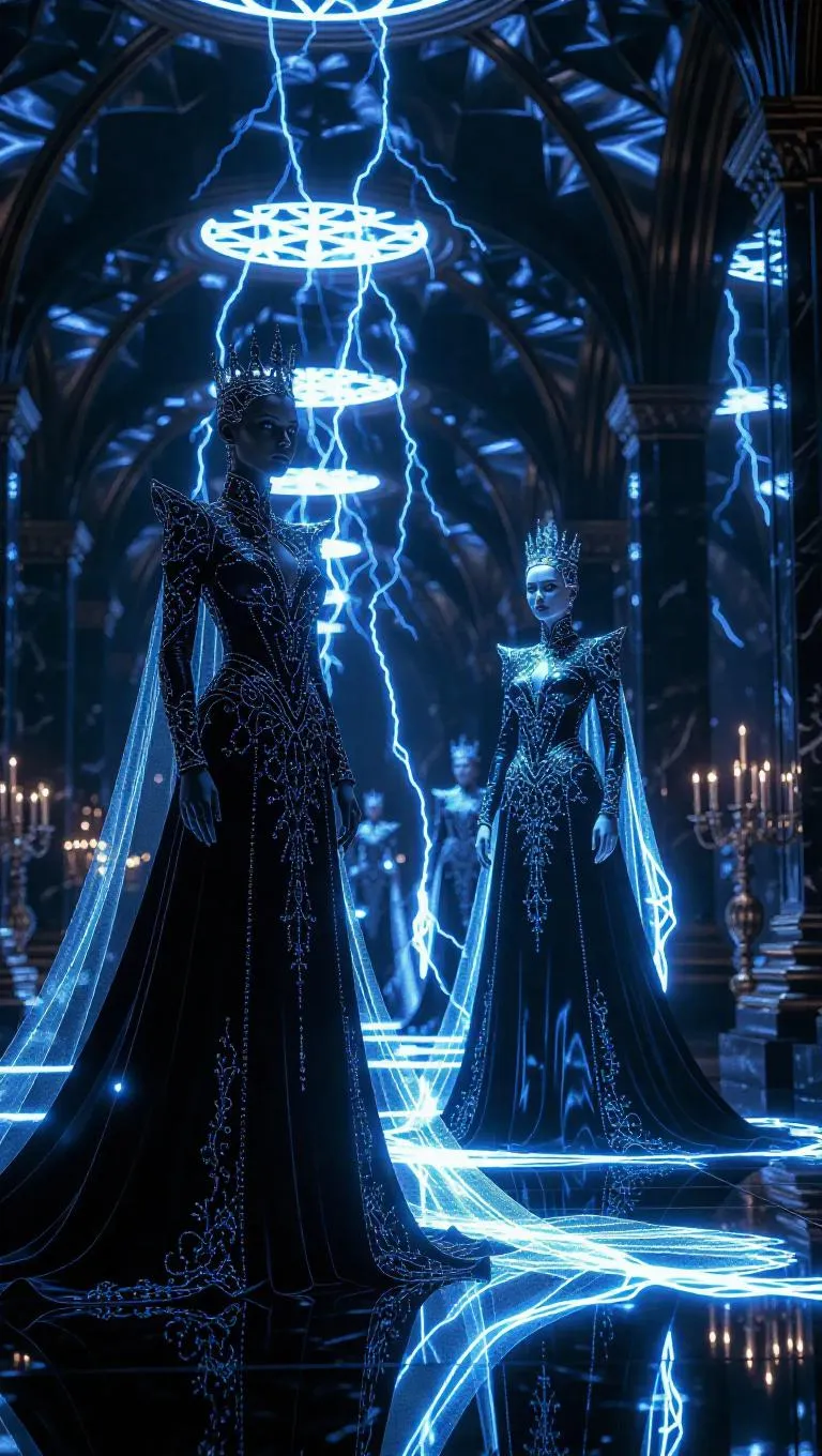 A majestic fantasy realm crafted from shimmering mirrors and electric lightning storms, where old and young versions of the same regal queen stand side by side, adorned in opulent, flowing garments. The 3D setting is a labyrinth of reflective surfaces and ethereal light, creating a surreal and enchanting atmosphere.