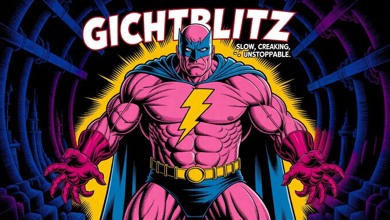 Aging superhero "Gichtblitz" with lightning bolt on chest, slightly overweight but determined. His motto: "slow, creaking, unstoppable." Underground comix style with exaggerated anatomy, grotesque realism, psychedelic colors. Heavy black inking, dramatic shadows on aging body, detailed cross-hatching. Surreal backgrounds with bizarre architecture and distorted perspective. hyper-detailed anatomy, grotesque musculature, heavy black inks, acid-bright colors, psychedelic elements, extreme expressions, underground aesthetic, cross-hatching, shadowy contrasts, surreal distortions, grainy texture, heroic pose, weathered look, dynamic composition, visceral energy
