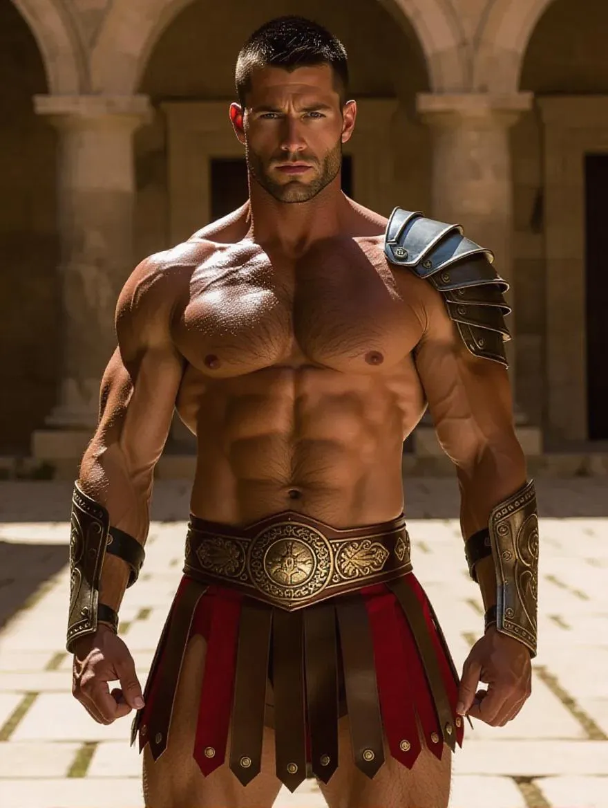 A powerful and handsome ancient warrior standing confidently in a sunlit stone courtyard. He has a mus ular, athletic body with a strong jawline, trimmed beard, and intense blue eyes. His dark hair is short and neatly styled. He wears detailed silver and red leather armor on his shoulders and forearms, with an ornate belt featuring classical motifs and a ((shorten-short)) leather gladiator skirt which shos most of his red underwear. His chest and abs are bare and glistening in the sunlight. The background is an ancient Roman or Greek palace with large stone arches and columns. Sensual. Sexy. Sensual vibe. Full body image