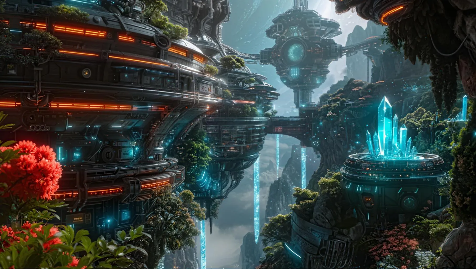 AI-generated digital art of a fearless sci-fi fantasy explorer navigating futuristic realms with advanced tech, mystical crystals, and glowing flora. Ultra-detailed 8K/16K resolution, realistic textures, grand panoramas, and immersive atmosphere. Craft mesmerizing sci-fi universe visuals using Vivago.ai's AI image tools for professional-grade, captivating storytelling in every scene.