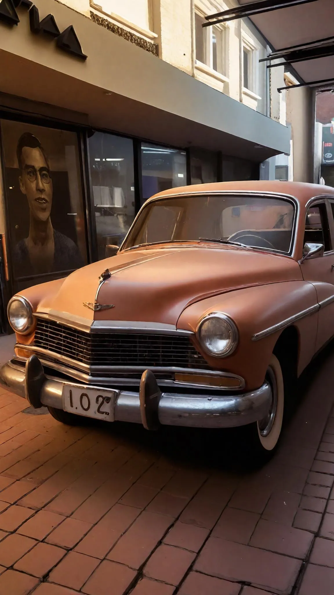 Generate a nostalgic 1980s urban scene with AI: classic car parked on brick-lined streets, retro storefronts, and pedestrians in vintage attire. Vivago.ai crafts cinematic visuals with soft evening lighting and Aqua effects for professional-grade retro ambiance. Transform text prompts into AI-generated images blending nostalgic charm and creative precision.