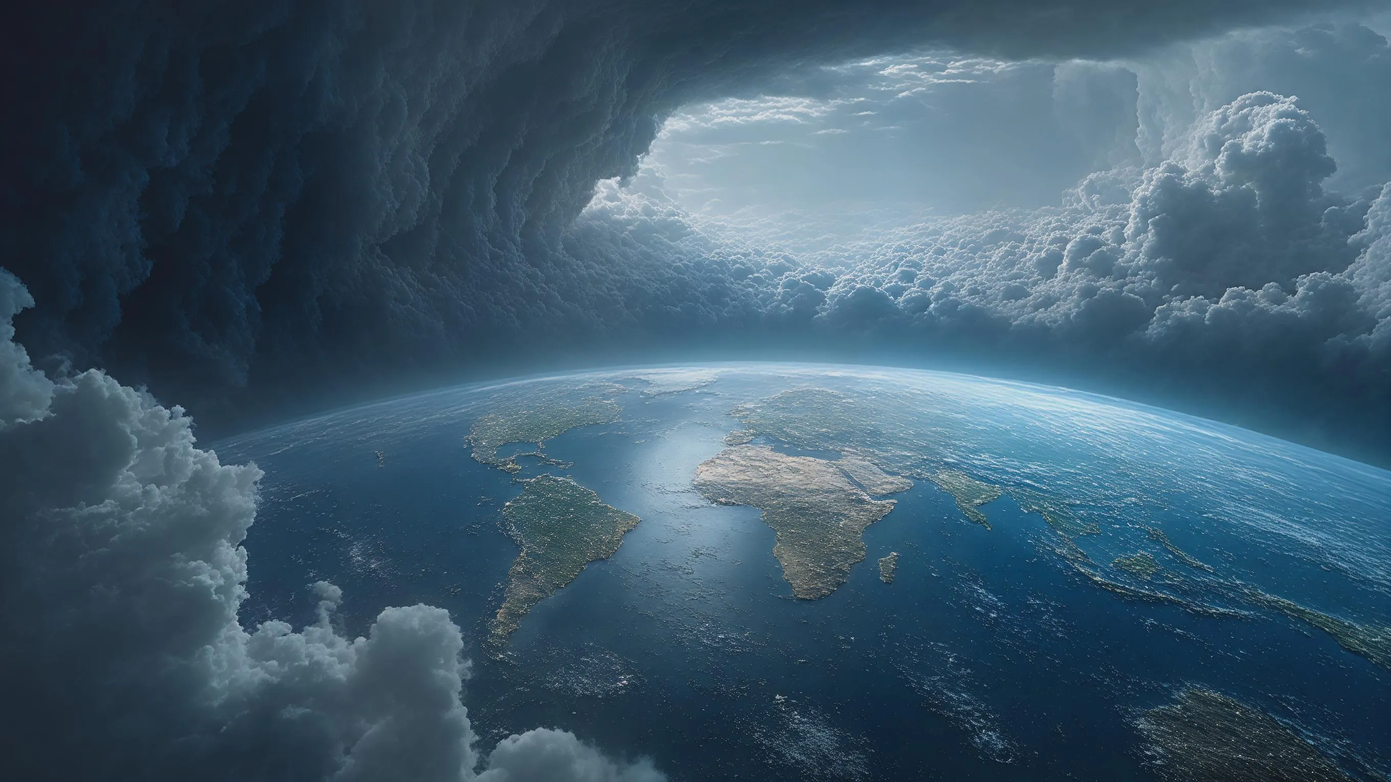 Visualize an apocalyptic planetary storm engulfing Earth with massive dark clouds. Experience AI-generated visuals of immense scale: helpless continents, dark cinematic atmosphere & imminent erasure. Create transformative, epic 16:9 visuals with VivaGo AI's image generator. Experience creation at cosmic scale. Explore AI-powered visual storytelling. (Word count: 49)