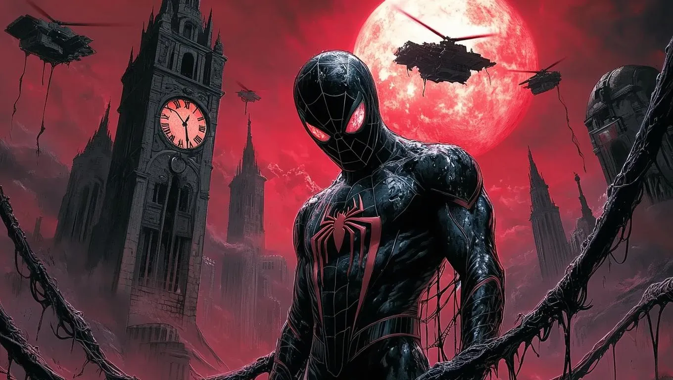 Generate AI horror art of symbiote Spider-Man as Goya's Saturn, consuming robotic clones in a nightmarish landscape. Vivago.ai transforms prompts into professional-grade visuals with bleeding-edge AI effects. Create melting web-clocktowers under blood moon skies with SHIELD helicarriers – perfect for dark superhero concept art and visual storytelling.