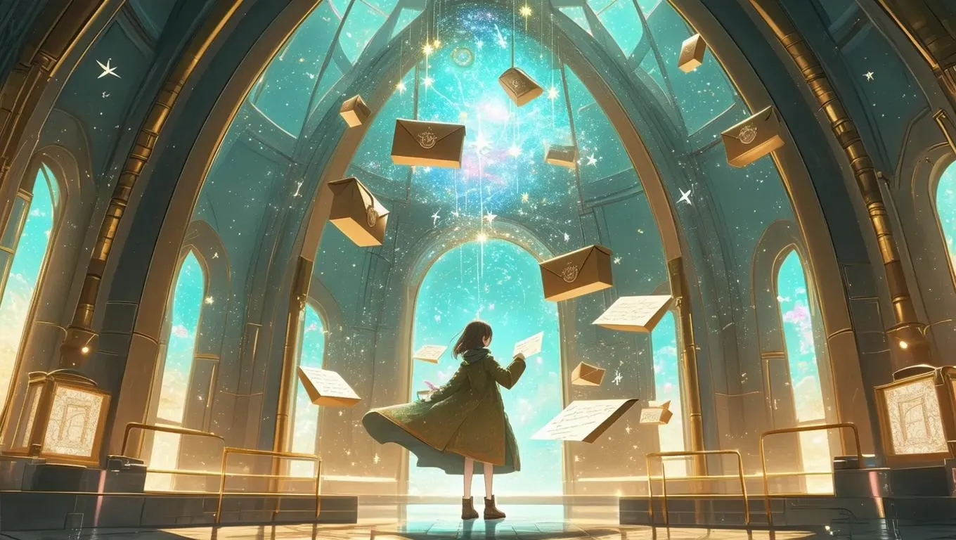 AI-generated anime art depicts a celestial spaceport cathedral with brass accents, cosmic watercolors, and starlit runes. An anime girl sends a glowing letter amid floating planetary parcels under a constellation-mapped dome. Soft pastel starbursts and cinematic lighting enhance this serene sci-fi scene—crafted with AI effects for ethereal watercolor textures and fantastical storytelling visuals.
