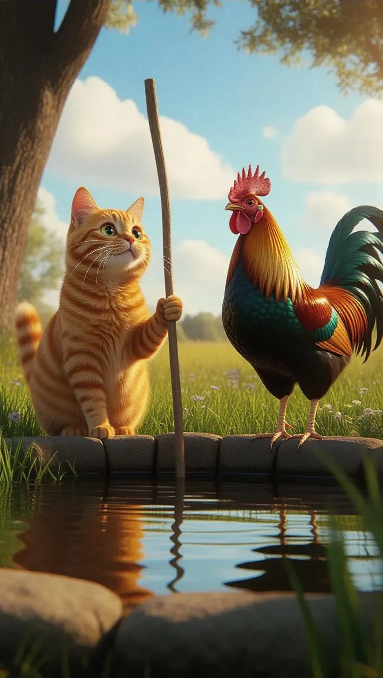 Create a whimsical countryside scene with an orange tabby cat holding a wooden stick and a curious rooster, exploring a sunlit fish pond. Crafted with vivago.ai's AI image generator, blend playful storytelling and vivid AI-generated visuals for enchanting, professional-grade art. Transform your ideas into captivating images effortlessly.
