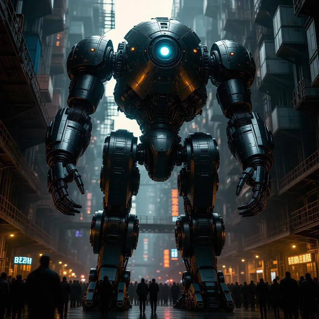Create a colossal robot of light and dark metal in a futuristic cityscape, featuring intricate mechanical panels, a massive cockpit, and powerful limbs. AI-generated imagery contrasts the mechanical giant's imposing structure with awestruck crowds amidst industrial-futuristic architecture with glowing details. Explore professional-grade AI effects for dynamic sci-fi visuals blending technological might and human emotion.